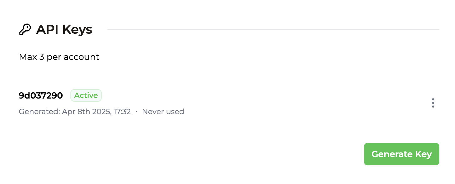 Every account can create a maximum of 3 API keys from the Integration Page. If you’ve already signed up, you’ll have created one during onboarding. Trophy keeps track of and displays when each API key in your account was created and when it was last used so you can easily keep track of usage.