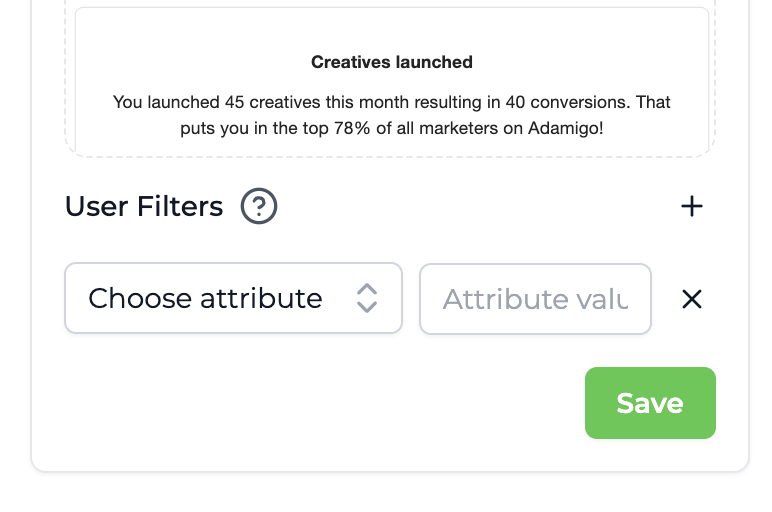 Each email template can be limited to users with specific custom user attribute values. For each attribute you’d like to restrict the email to, click the plus icon next to the User Filters header for the email template, then select the attribute and enter the desired value. Only users that have all specified attribute values will receive emails from this template.