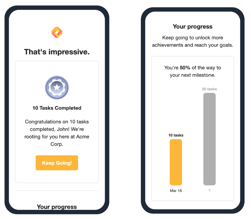Achievement emails congratulate users when they complete an achievement you’ve configured in Trophy. These emails send between 5-9PM on the day the achievement is completed, or the next day at 5PM if it is past 9PM when the user completes the achievement.