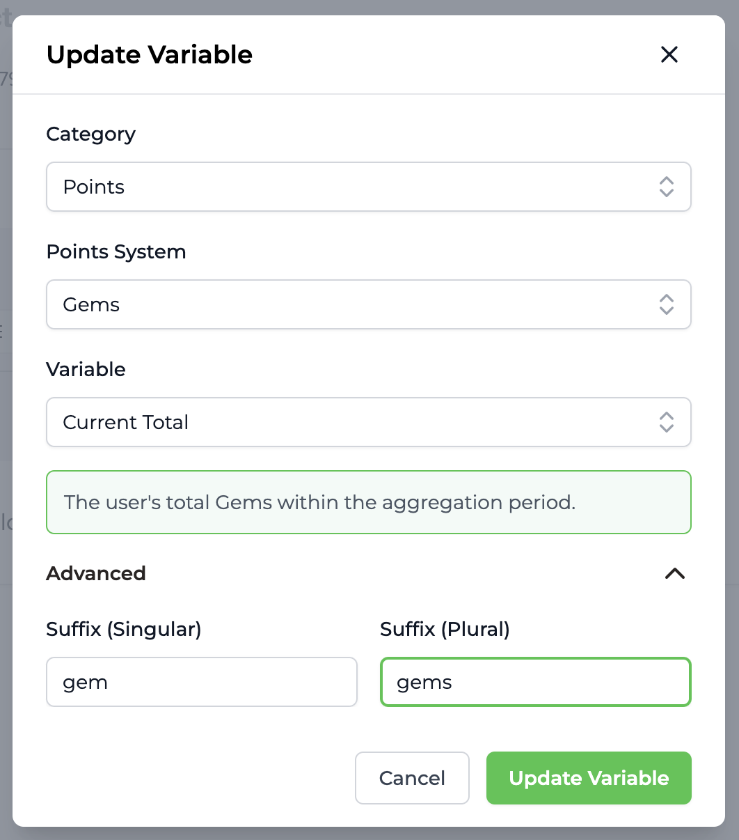 Similarly to metrics, each points system has the following variables that can be used to add dynamic data to email copy: