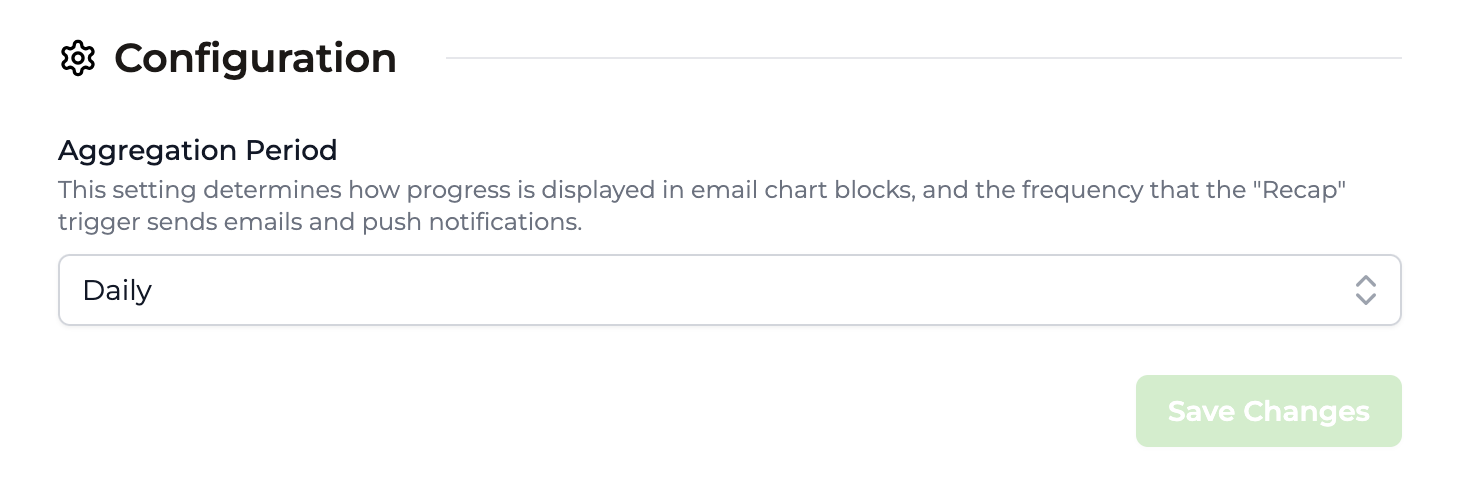 Recap emails send weekly or monthly progress reports to users. You can change the frequency of these emails on the integration page using the Aggregation Period setting.
