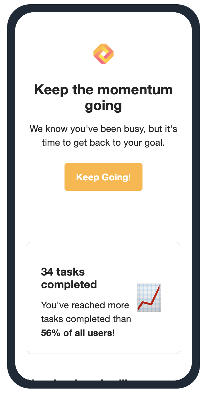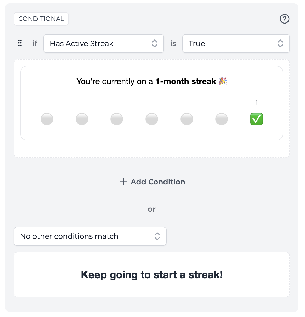 One common use case for the conditional block is to conditionally show a user their streak (one of Trophy’s built-in Smart Blocks) and some streak-related motivational text only if they have an active streak. If the recipient isn’t on a streak at the time the email is sent, then a simple message is displayed instead.