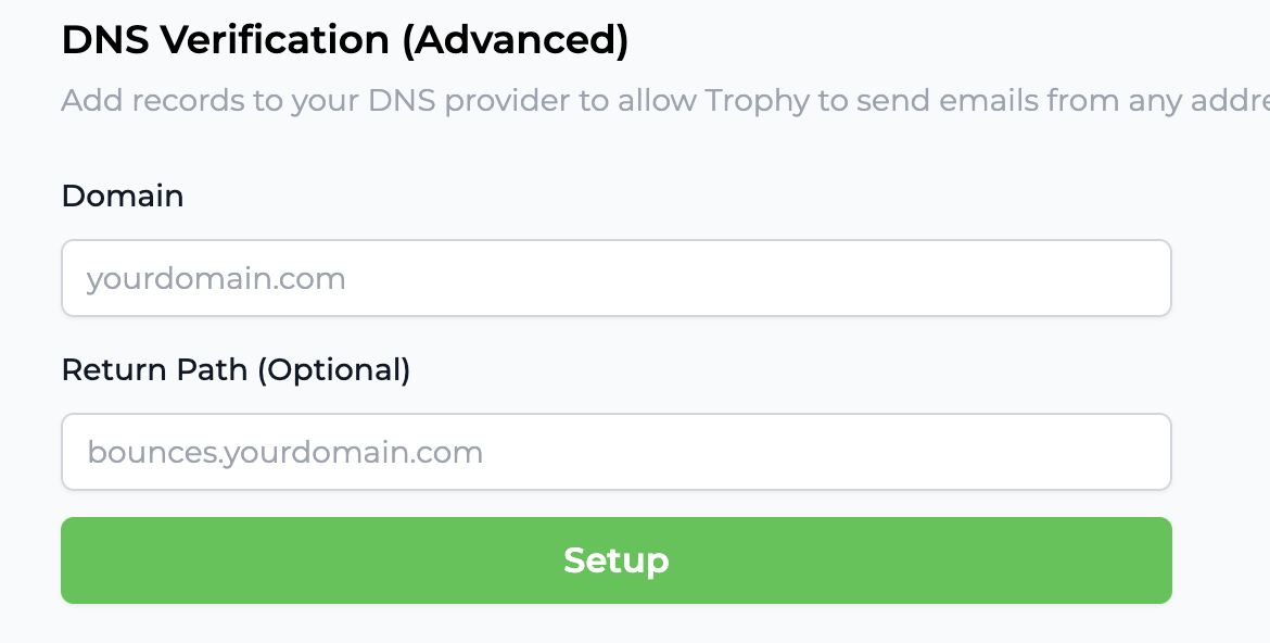 Head down to the DNS Verification section and enter the domain you want to set up with Trophy.You can also also configure a custom Return Path. This is where Trophy will forward notifications of bounced emails to help you investigate deliverability issues: