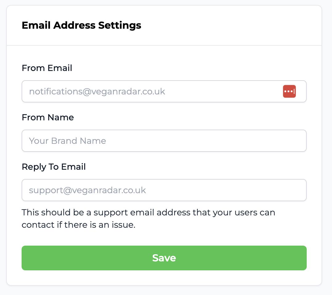Once your DNS records are verified, it’s time to choose the email address you want to send emails from. Note that now you’ve fully verified your domain, you can change this address whenever you like without impacting deliverability.Simply enter the email address you want Trophy to send from, the name to show to users in the inbox when they receive emails and a support email address they can use to contact you if needed: