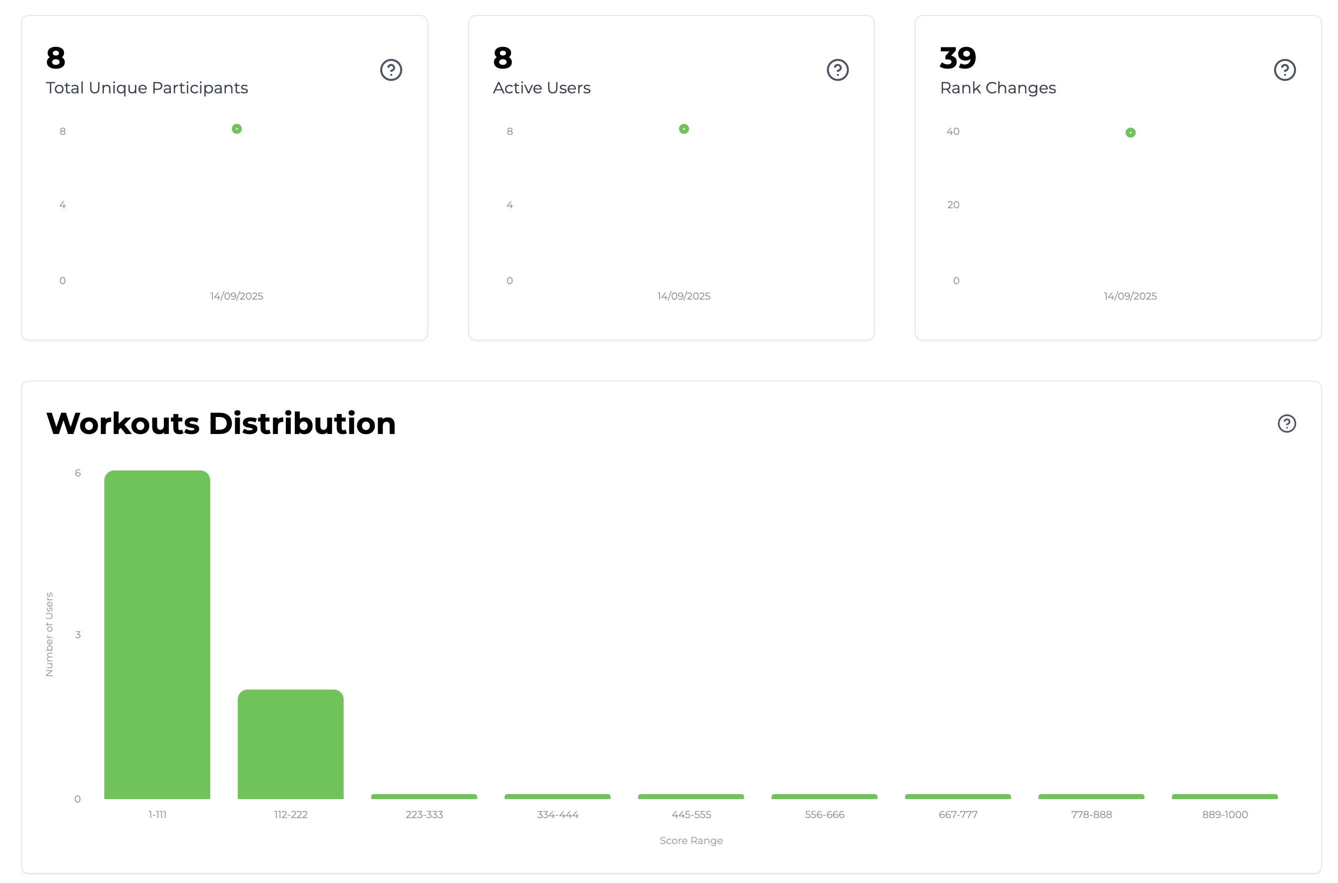 This chart shows how many unique users have participated in any run of a leaderboard over time. This is useful to understand how many of your users actually take part in leaderboards and how participant limits are affecting this.