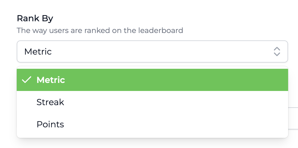 Metric leaderboards are linked to an existing Trophy Metric and rank users based on their total metric value. Use metric leaderboards if you only want to rank users based on a single interaction.Points Rankings
